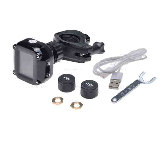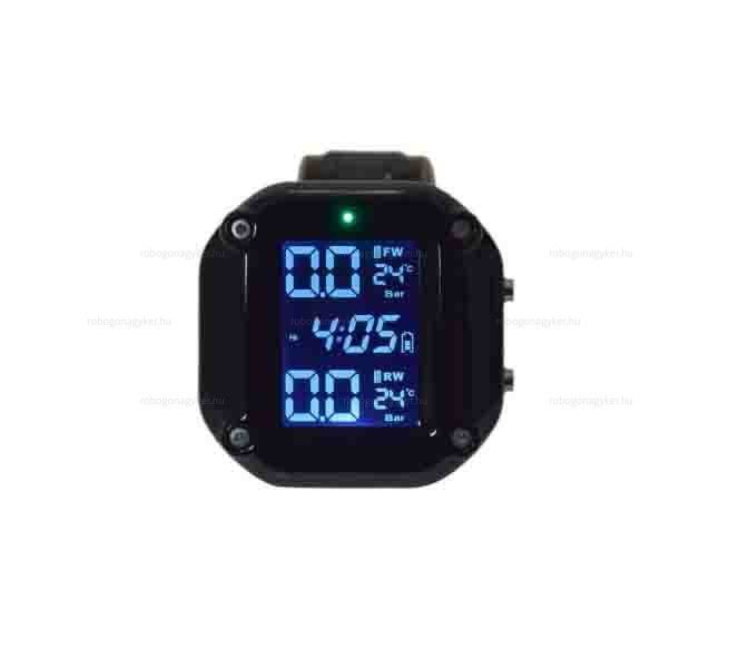 Gumiabroncsnyomás-érzékelő átlátszó LCD kijelzővel. A készlet tartalmaz egy mágneses töltőt és egy fogantyút állítható dőlésszöggel. Riasztórendszerrel rendelkezik a gumiabroncs hőmérséklet és nyomás figyelésére.Vízálló, ABS anyagból.